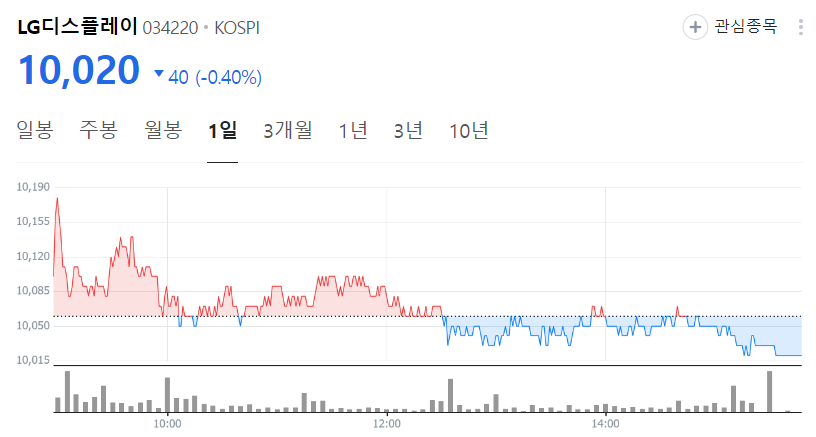 LG디스플레이 현재 주가는 10,310원이며 전일 대비 -50원의 모습을 보이고 있습니다. LG디스플레이의 주주현황을 살펴보면 LG전자 주주가 전체 지분 36.72%를 소유하고 있습니다. LG디스플레이는 디스플레이 및 관련부품 기업으로 장중 기준으로 주가는 10,310원 입니다. LG디스플레이의 시가 총액은 5조300억 원이며 발행 주식수는 500,000,000주 입니다. 외국인 보유 비중은 21.04% 이며 장중 거래량은 1,124,572원 을 기록했습니다. 매출액은 213,308억 원을 달성했습니다. EPS는 -2,158원이며 LG디스플레이 주식 배당수익률은 % 입니다.